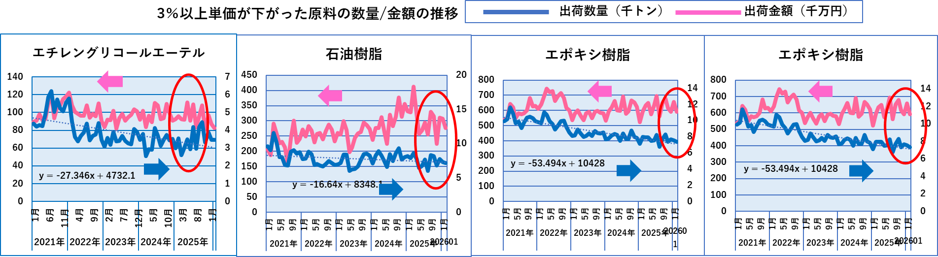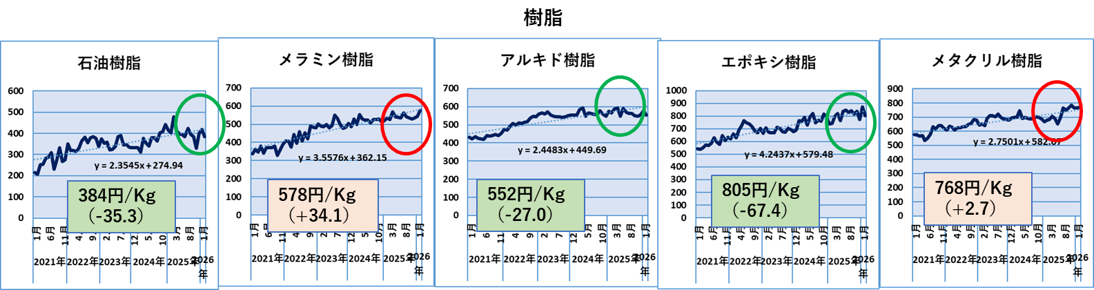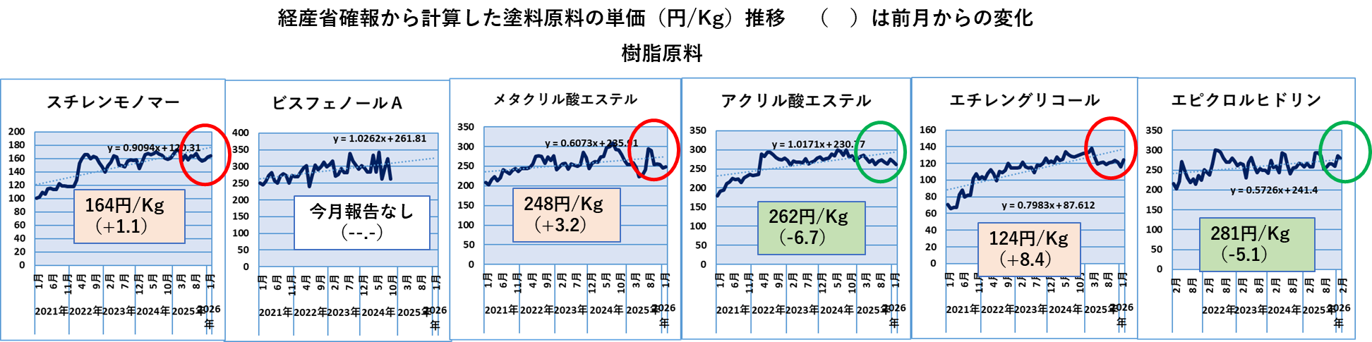 先月の樹脂は全て単価上昇でしたが、2月は石油樹脂、アルキド樹脂、エポキシ樹脂の単価が下降しました。