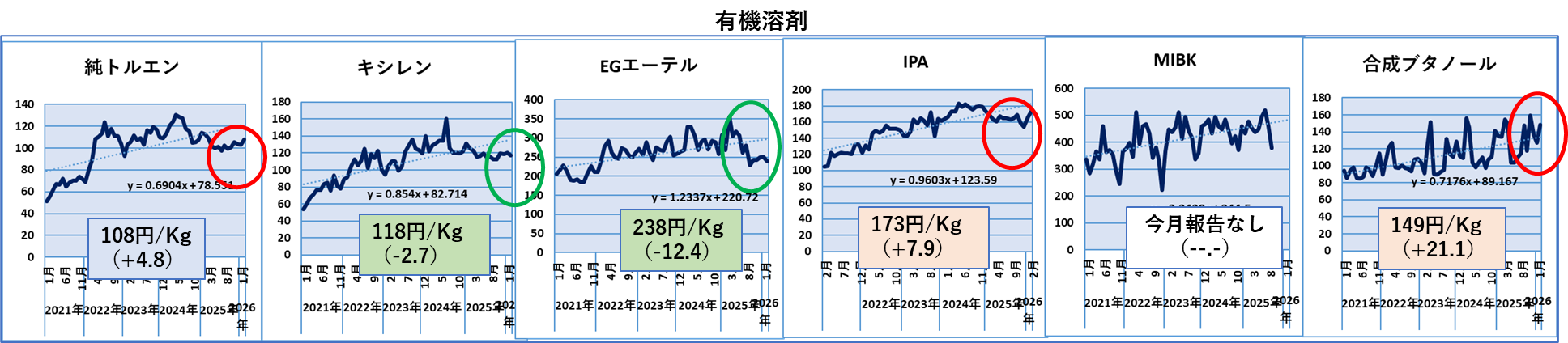 前月から3%以上の変化はエチレングリコールエーテルの単価上昇のみでした。続いて有機溶剤です。