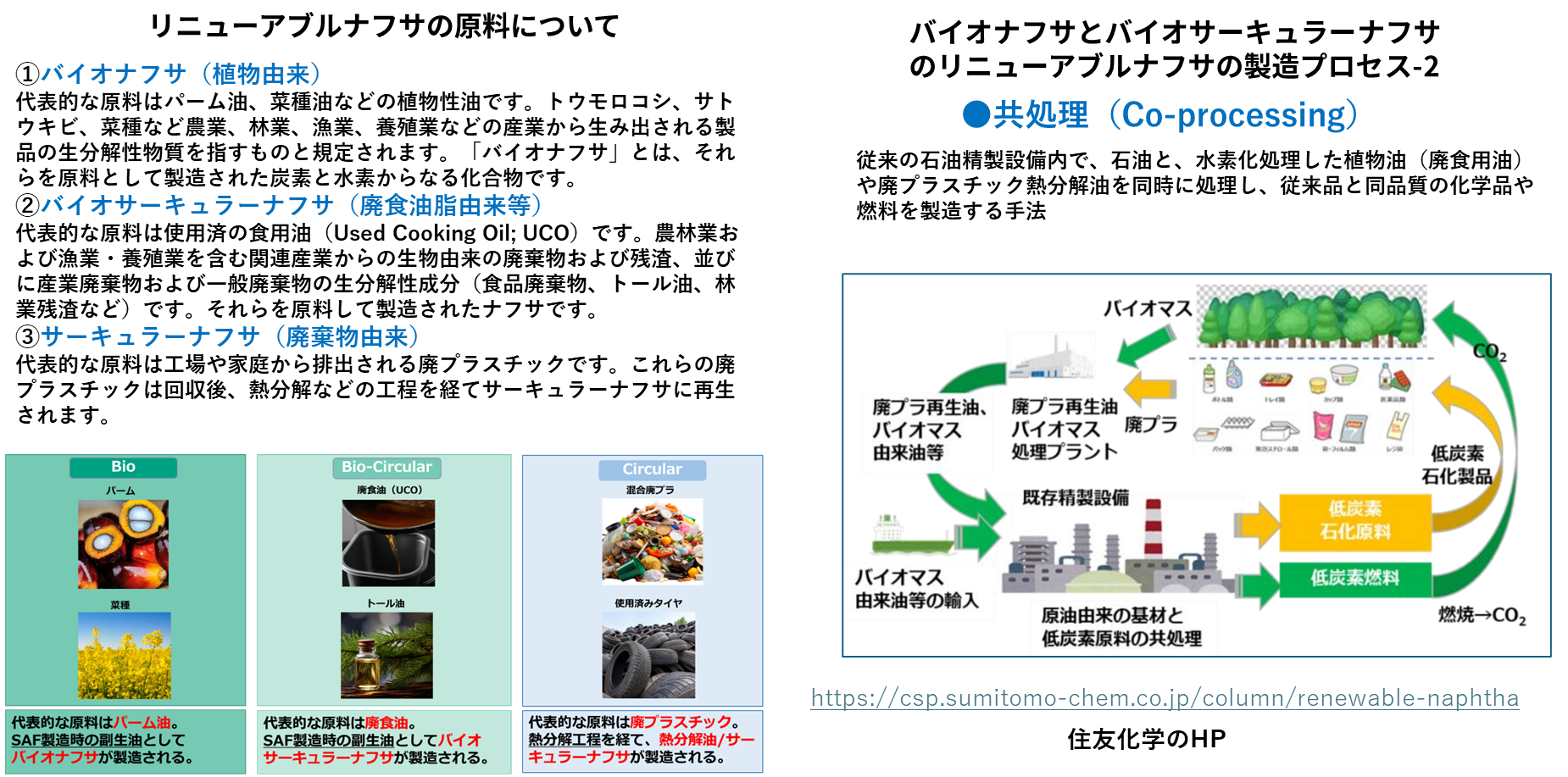 住友化学では、「リニューアブルナフサ」としてもう少し幅広く捉えて説明しています。上の三井化学では、植物由来のナフサのみを取り上げていましたが「リニューアブルナフサ」となるともう少し対象範囲が広がり、植物由来のバイオナフサに加え、廃食油由来などのバイオサーキュラーナフサ、さらに廃プラスチックから再生されるサーキュラーナフサの3種類があると説明されています。(下図左側参照)
