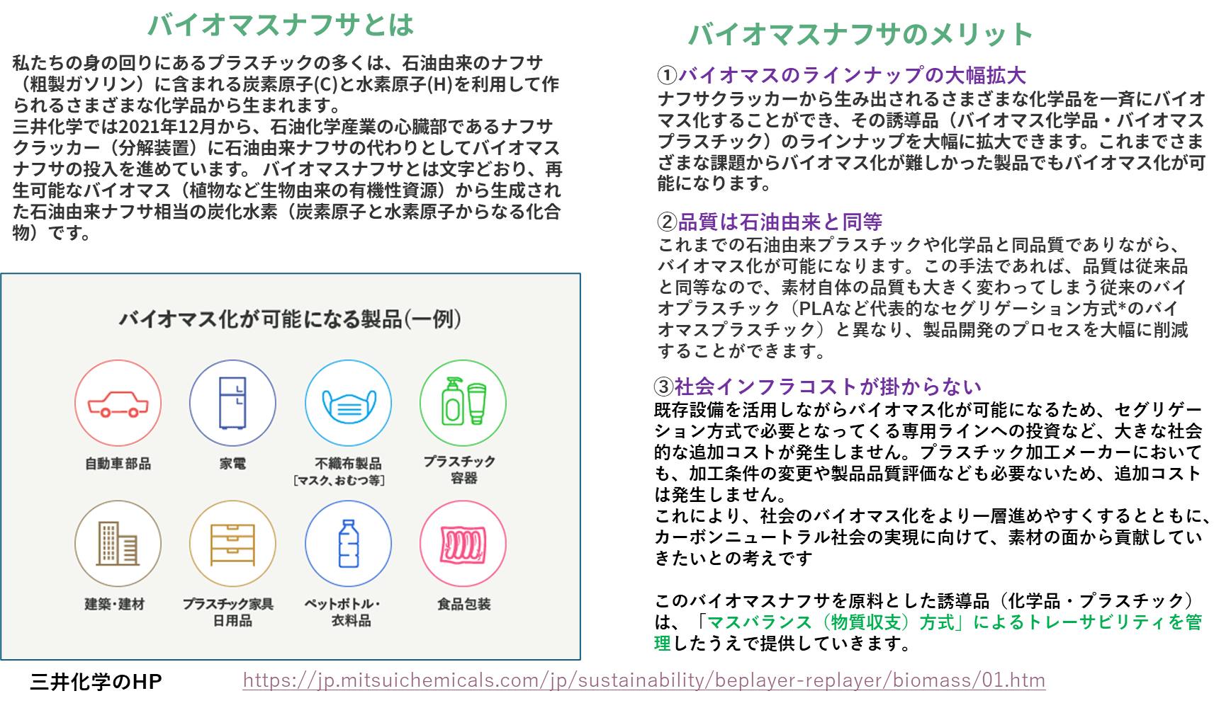 三井化学のサイトでは、バイオマスナフサについて「バイオマスナフサとは文字どおり、再生可能なバイオマス(植物など生物由来の有機性資源)から生成された石油由来ナフサ相当の炭化水素(炭素原子と水素原子からなる化合物)です」と説明しています。三井化学では後述するようにすでに大阪工場で、通常のナフサプラントにバイオマスナフサを石油系ナフサに混ぜて使用しており、バイオマスナフサを使用するメリットについては ①生み出されるさまざまな化学品を一斉にバイオマス化することができ、その誘導品(バイオマス化学品・バイオマスプラスチック)のラインナップを大幅に拡大できる ②品質は従来品と同等であり、PLA(ポリ乳酸)などに比べ製品開発のプロセスを大幅に削減することができる ③従来の設備がそのまま使用できるため社会インフラコストが掛からないことを挙げています。(下図参照)