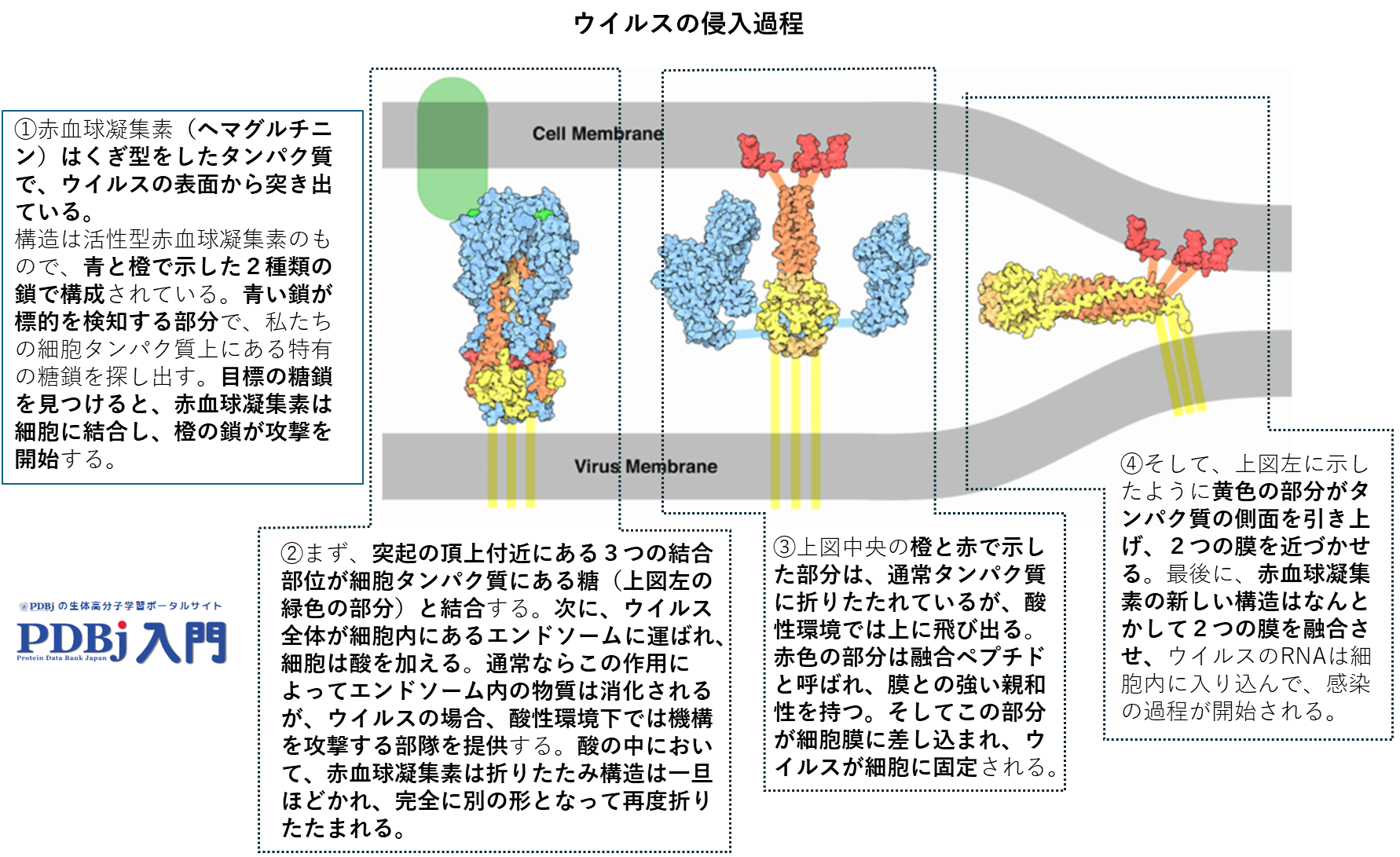 この図はウイルスの侵入過程を示しています。ヘマグルニチンは、標的を探し出し、極めて巧妙な仕掛け(酸性条件下を利用し攻撃部隊を構築する)で細胞に取り付きます。さらにウイルスと細胞の二つの膜を融合させるのです。