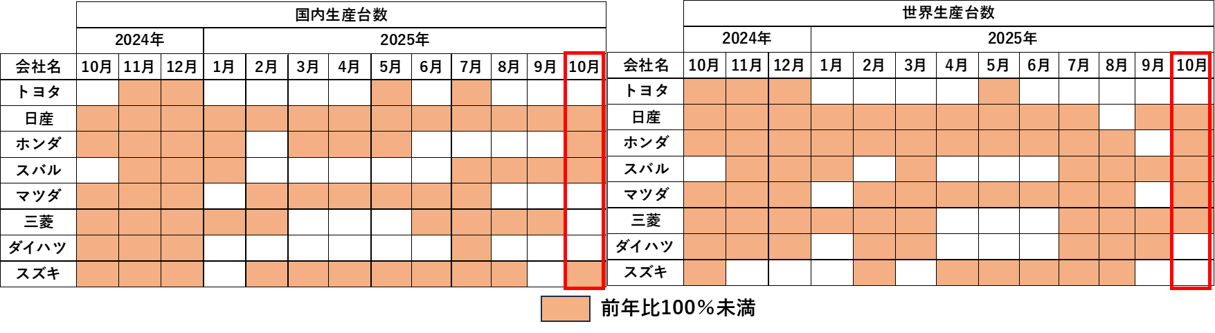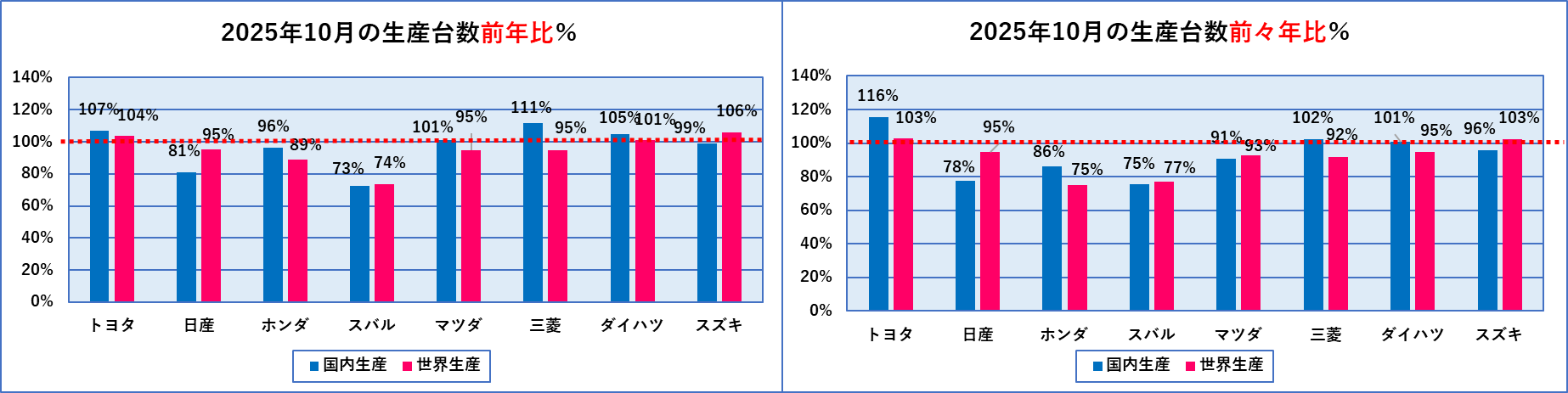 一方で、日産とスバルは国内、世界とも前年比二けたマイナス、ホンダも世界は二けたマイナスと振るいませんでした。前々年同月比についても前年同月比とほぼ同じで、二けたマイナスの会社が目立ちました。