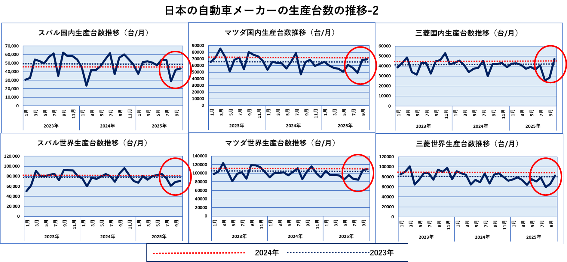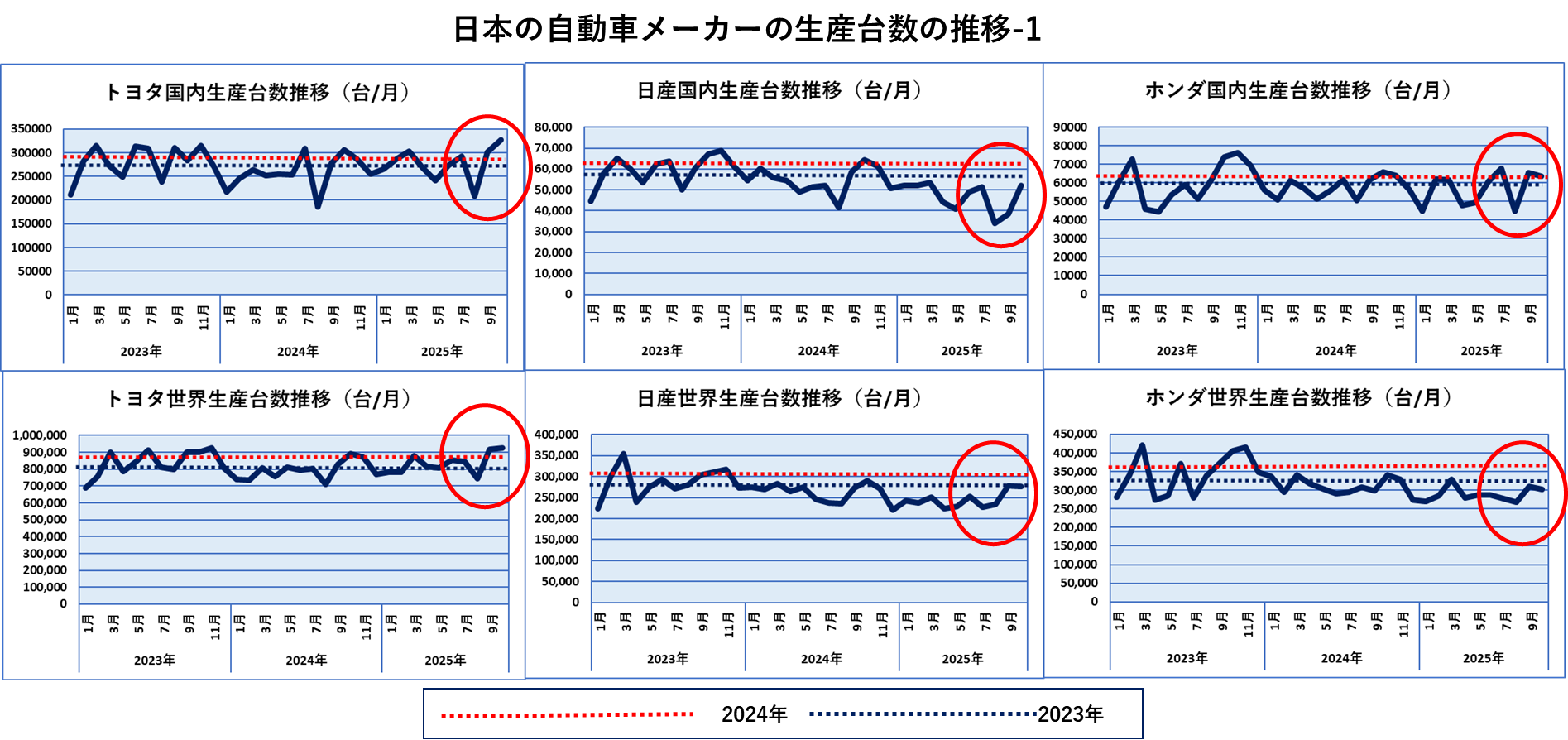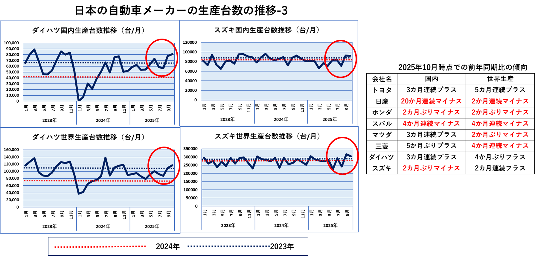 ダイハツがようやく2024年の生産停止期間以前の水準に戻ったか?スズキは好況維持、といったところでしょうか?