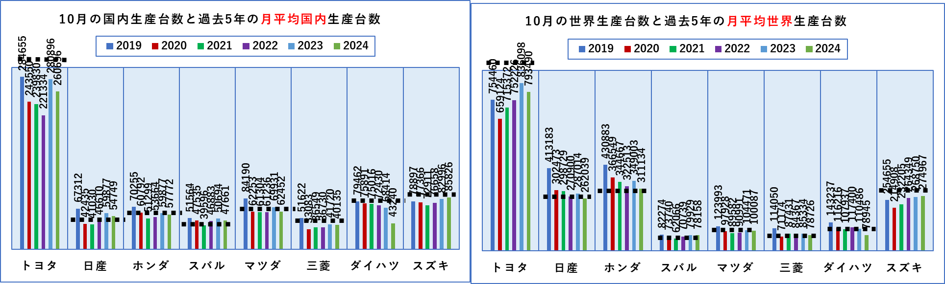 10月の生産台数を過去6年間の月平均台数と比較したデータです。トヨタとスズキは国内、世界とも6年間のすべての月平均を超えています。それ以外の会社はおおよそ2019年の月平均には及ばず、わずかにダイハツの国内生産が2019年の月平均を上回っているに過ぎません。