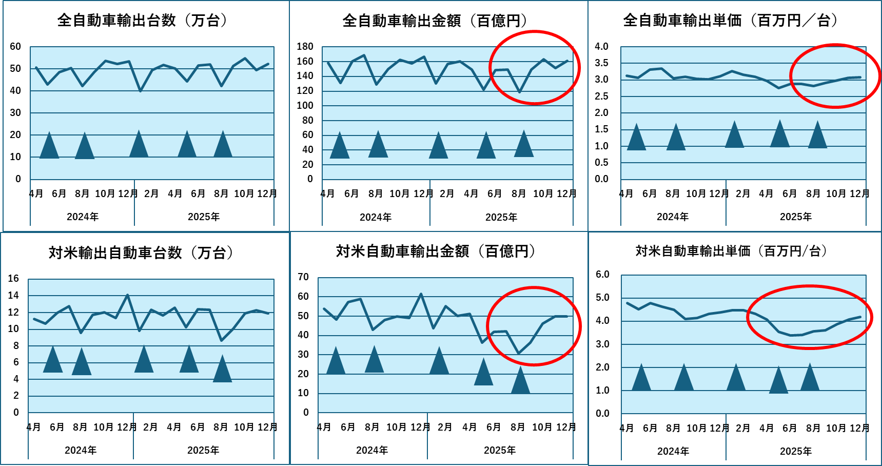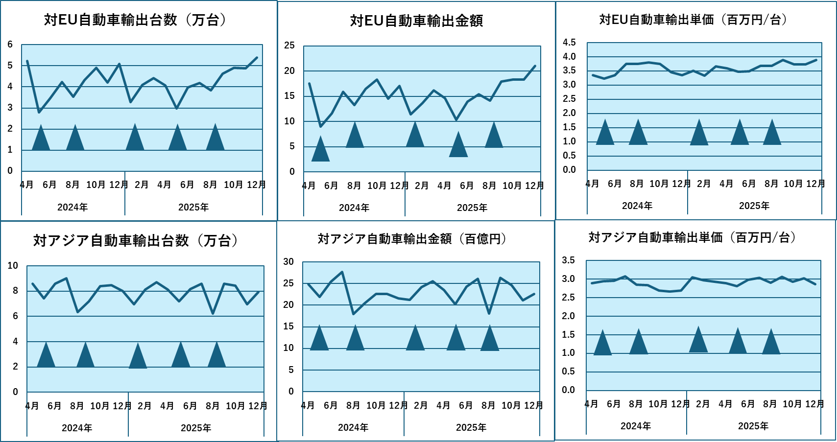 上から全体、対米、対EU、対アジアです。左から右へ台数、金額、台あたり単価です。▲は日本の休日が多いために輸出台数が定期的に少なくなる月(1月、5月、8月)を示しています。