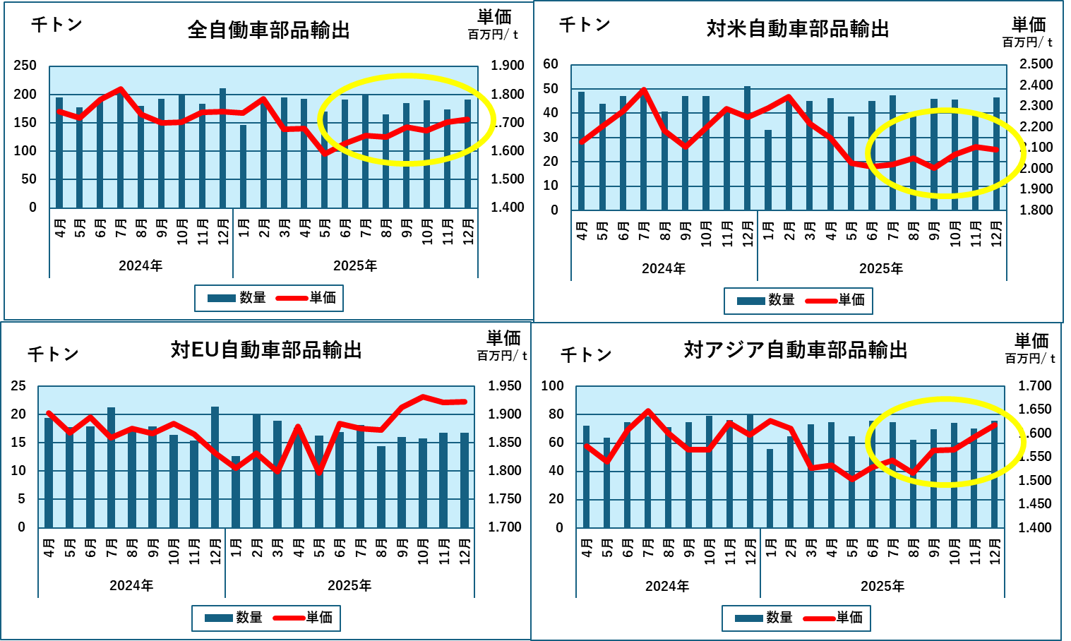 トランプ関税発動以来の対米輸出における単価の落ち込みは緩やかに解消されているように見えますが、果たしてそれは本当にそうなのか後で検証したいと思います。対EU、対アジアの単価は特に目立った動きはありません。
