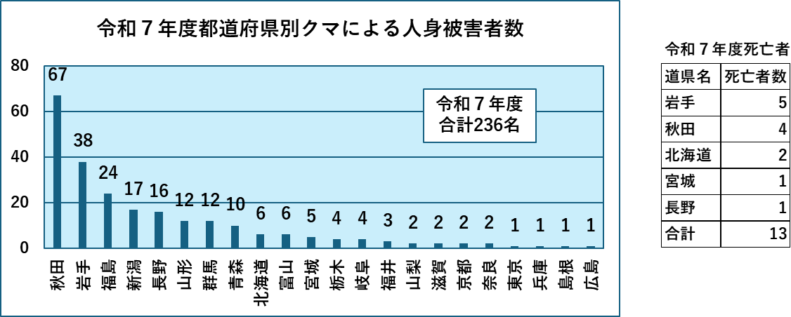 令和7年度の都道府県別被害者と死亡者数についてまとめてみました。236名の被害者のうち半数以上が秋田、岩手、福島の3県で占められました。死亡者に至っては秋田、岩手の両県で約7割になります。