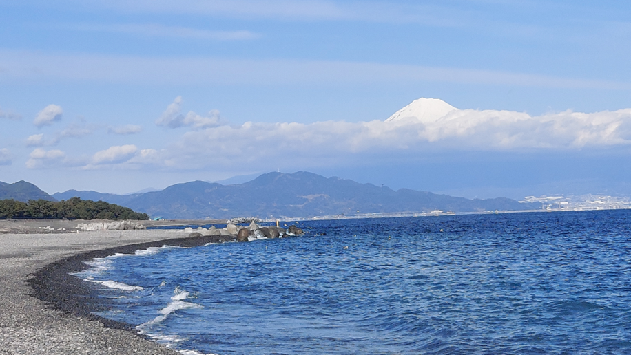 お待たせしました。2026年元旦の富士山の写真です。今年は、天女の羽衣で有名な静岡県清水区の三保の松原に行ってきました。よく晴れていたのですが、あいにく富士山には雲がかかり全景を撮ることはできませんでした。